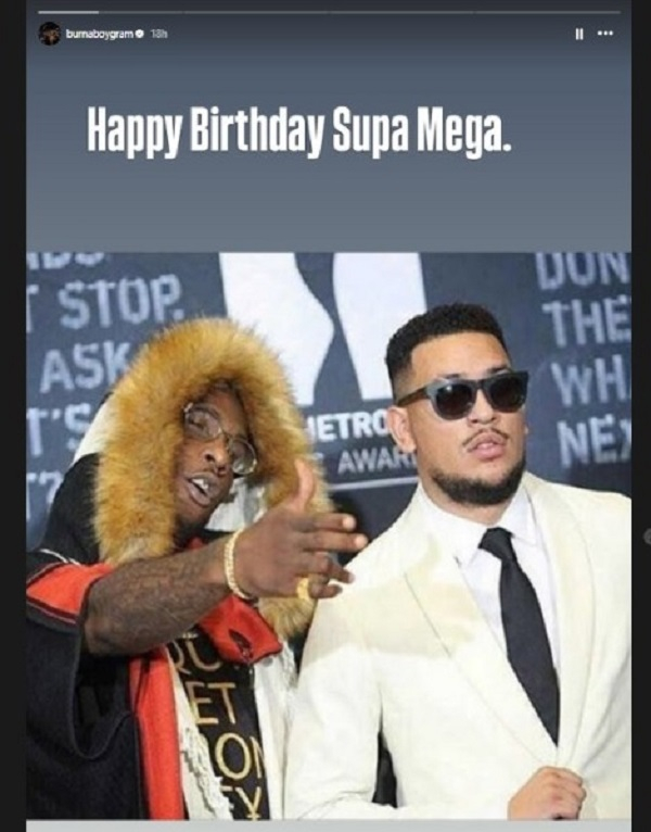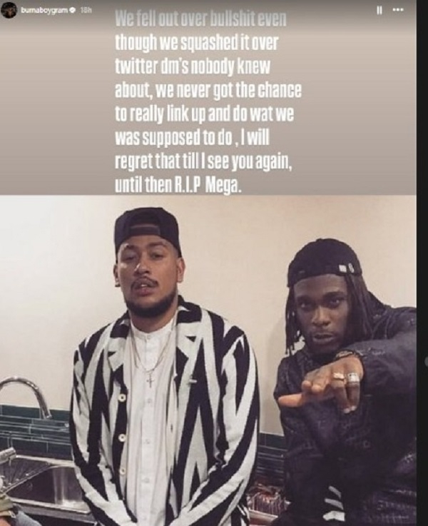 Burna Boy wrote: “Happy birthday Supa Mega. We fell out over bullsht. Even though we squashed it over Twitter DMs nobody knew about, we never got the chance to really link up and do what we were supposed to do. I will regret that until I see you again. Until then, R.I.P Mega.”