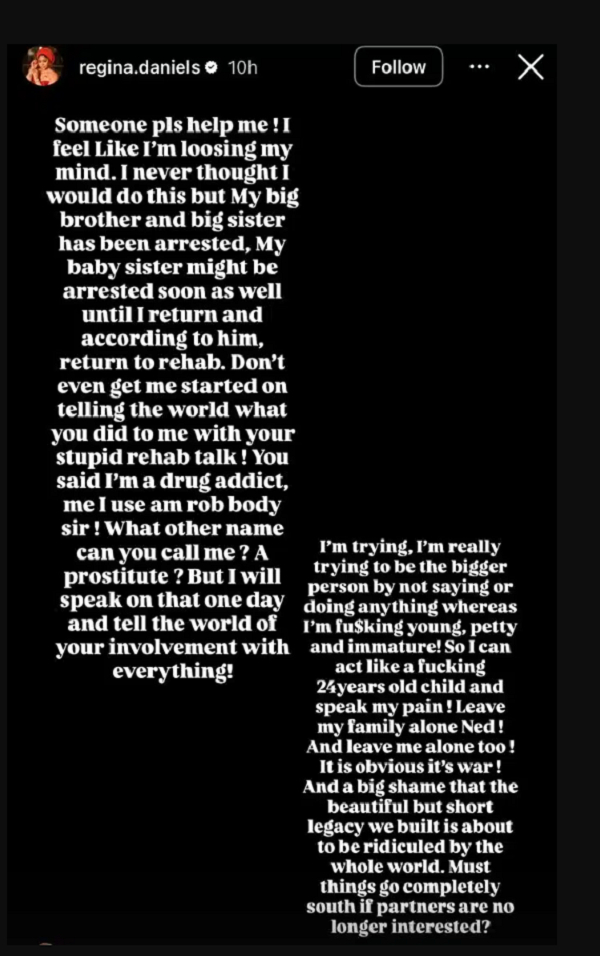 The ongoing tension between Nollywood actress Regina Daniels and her husband, Senator Ned Nwoko, has taken a dramatic turn as the actress broke down in tears on social media, accusing the lawmaker of ordering the arrest of her elder brother and sister.