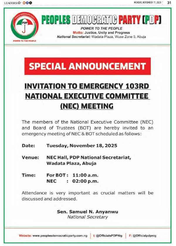 A faction of the Peoples Democratic Party (PDP) led by FCT Minister Nyesom Wike has summoned an emergency meeting of the party’s Board of Trustees and National Executive Committee for November 18, 2025.