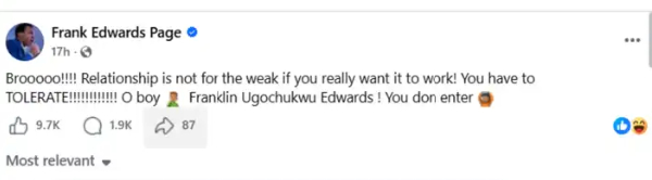 “Brooooo!!!! Relationship is not for the weak if you really want it to work! You have to TOLERATE!!!!!!!!!!!! O boy Franklin Ugochukwu Edwards! You don enter.”